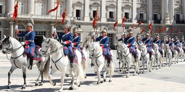 La Guardia Real adquirió su configuración orgánica actual como regimiento por Orden del Ministerio del Ejército de 31 de diciembre de 1975, denominándose Regimiento de la Guardia Real. En él se integra el ahora denominado Escuadrón de Lanceros, bajo el mando de un capitán y tres tenientes; consta de sección de plana mayor, escuadra de batidores, banda de cornetas y tambores, dos secciones de coraceros y dos secciones de lanceros, con 116 caballos de pura raza española —tordos para lanceros y batidores, castaños para coraceros—. Forma parte del Grupo de Escoltas, rindiendo honores en relevos solemnes, desfiles, presentación de credenciales de embajadores a S.M. el Rey y custodias en el Palacio de la Zarzuela y Reales Sitios. Recientemente, se ha conmemorado el 150.º aniversario de la creación del Escuadrón de Escolta de la Guardia Real.