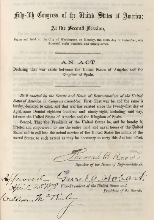En suma, la declaración de guerra del 25 de abril de 1898 constituye un caso paradigmático de cómo las democracias modernas formalizan el paso de la tensión a la guerra, integrando legitimidad interna, narrativa pública y acción militar efectiva, y supuso la reconfiguración del equilibrio de poder a finales del siglo XIX, inaugurando una nueva etapa en la historia militar y política internacional.